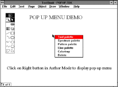 For the RButtonUp handler, I started by defining in the handler the linkDLL statement for the required function "popMenu" (see page 60 of the Asymetrix DLL Reference manual) . This is a function that displays a popup menu at a designated position. It is one of a number of functions available in the TBKWIN.DLL provided with Toolbook.