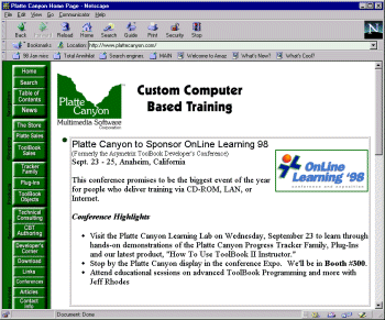 This site has a range of authoring tools to augment Toolbook including Tracker, Administrator, Navigator, and Test Tracker. Progress Tracker adds detailed user tracking, bookmarks, indexes, and "return to last page" functionality to any Toolbook training application - tracker provides the trainer the ability to track student progress through various training modules and includes a number of time-saving utilities. Navigator provides the ability for a developer to create an unlimited number custom navigation paths through a ToolBookŪ application -- without any custom scripting.