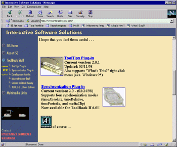 This site has a couple of great plug-ins for Toolbook. The Tooltips plug in creates small boxes with descriptive text which appear when users move their mouse pointer over certain objects. The Synchronization control is a plug-in which allows developers to synchronise animations and voice overs - or anything else requiring timers - without resorting to too much code. Any object can become a Synchronization control object.